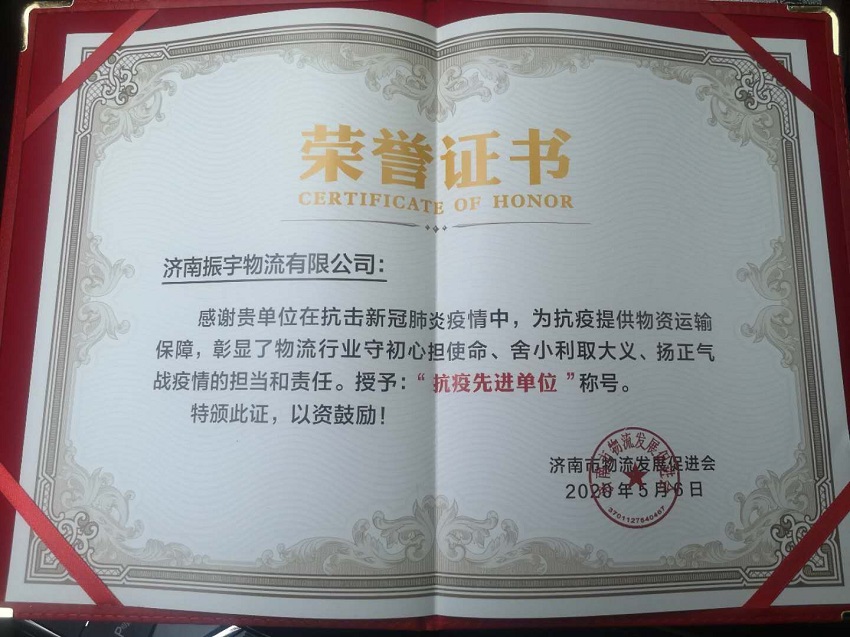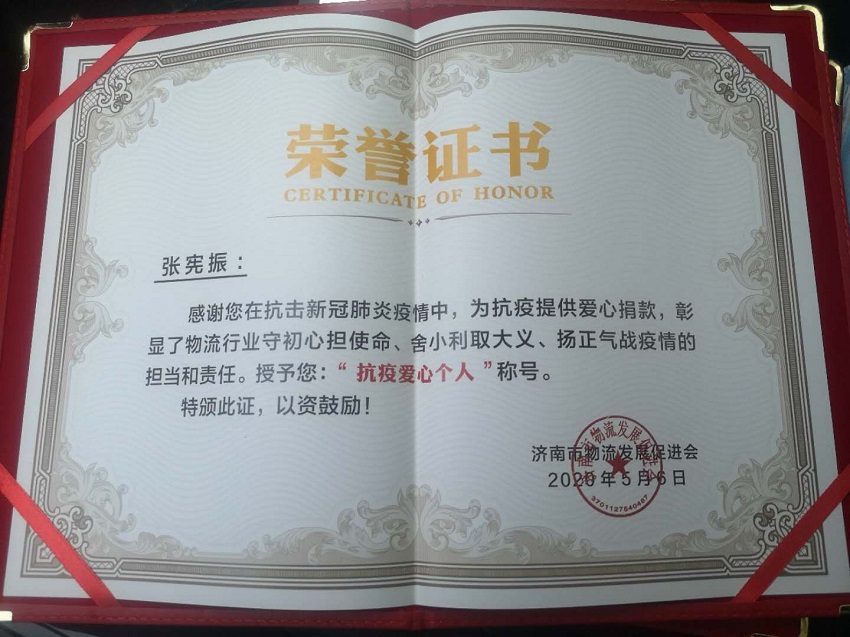 經(jīng)評(píng)選,振宇物流榮獲“抗疫先進(jìn)單位”,總經(jīng)理張憲振榮獲“抗疫愛(ài)心個(gè)人”!