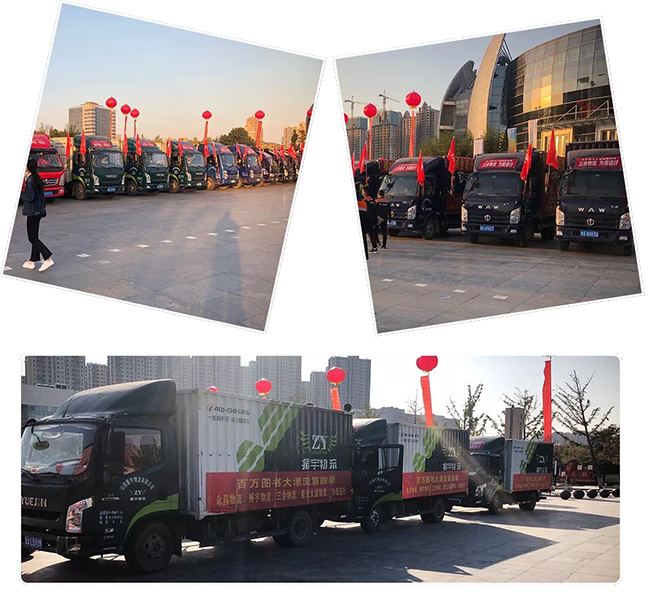 振宇物流積極捐贈圖書,為愛護(hù)航 ,通過自己的方式和力量,助力百萬圖書大漂流!現(xiàn)場物流車輛整齊排開,氣勢如虹……