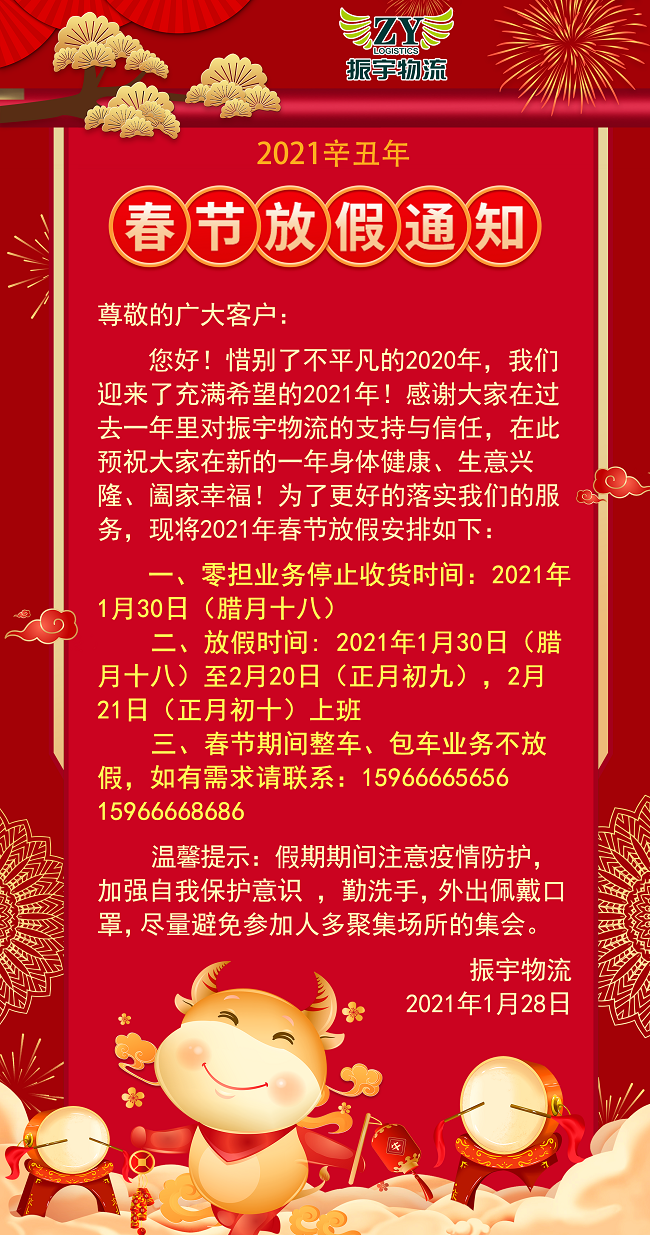 您好!惜別了不平凡的2020年,我們迎來(lái)了充滿(mǎn)希望的2021年!感謝大家在過(guò)去一年里對(duì)振宇物流的支持與信任,在此預(yù)祝大家在新的一年身體健康、生意興隆、闔家幸福!為了更好的落實(shí)我們的服務(wù),現(xiàn)將2021年春節(jié)放假安排如下: