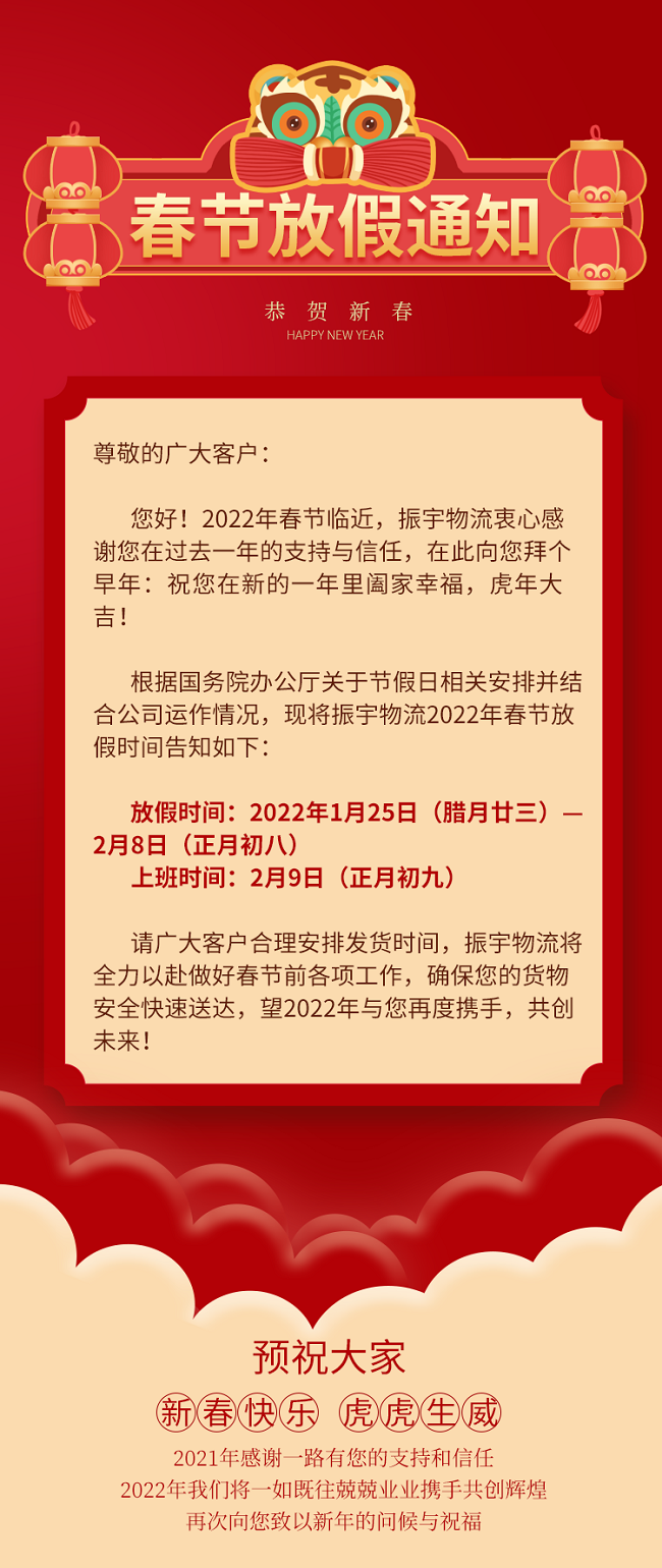 您好!2022年春節(jié)臨近,振宇物流衷心感謝您在過去一年的支持與信任,在此向您拜個早年:祝您在新的一年里闔家幸福,虎年大吉!