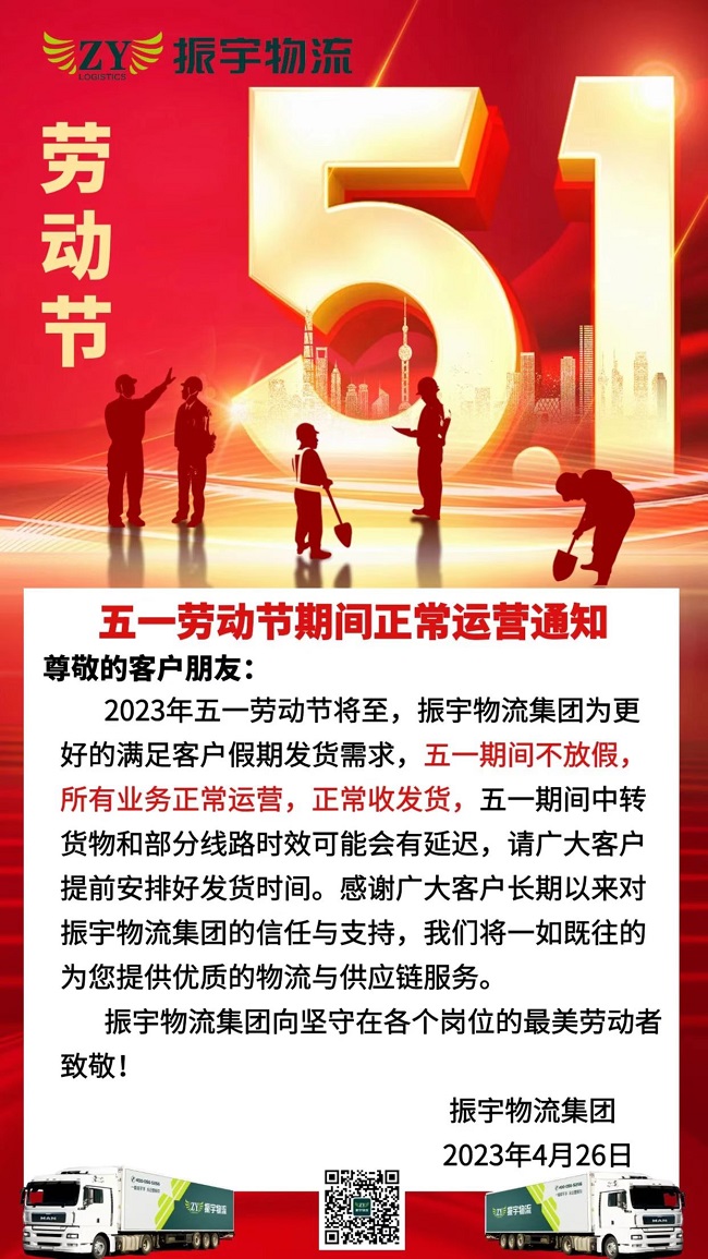 2023年五一勞動節(jié)將至,振宇物流集團為更好的滿足客戶假期發(fā)貨需求,五一期間不放假,所有業(yè)務(wù)正常運營,正常收發(fā)貨,五一期間中轉(zhuǎn)貨物和部分線路時效可能會有延遲,請廣大客戶提前安排好發(fā)貨時間。感謝廣大客戶長期以來對振宇物流集團的信任與支持,我們將一如既往的為您提供優(yōu)質(zhì)的物流與供應(yīng)鏈服務(wù)。