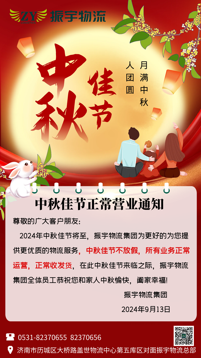 2024年中秋佳節(jié)將至,振宇物流集團(tuán)為更好的為您提供更優(yōu)質(zhì)的物流服務(wù),中秋佳節(jié)不放假,所有業(yè)務(wù)正常運(yùn)營(yíng),正常收發(fā)貨,在此中秋佳節(jié)來(lái)臨之際,振宇物流集團(tuán)全體員工恭祝您和家人中秋愉快,闔家幸福!