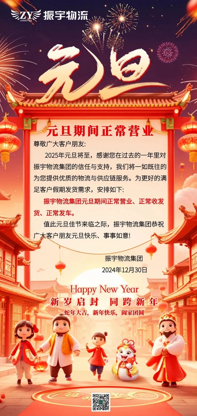 2025年元旦將至,感謝您在過去的一年里對(duì)振宇物流集團(tuán)的信任與支持,我們將一如既往的為您提供優(yōu)質(zhì)的物流與供應(yīng)鏈服務(wù)。為更好的滿足客戶假期發(fā)貨需求,安排如下: