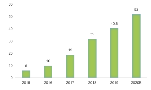 圖3 2015—2020年智能快件箱增長情況(單位:萬組)