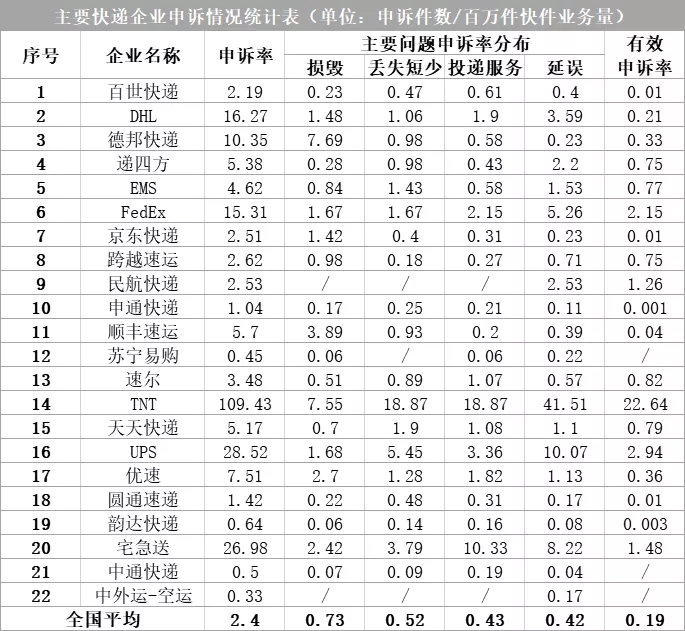 全國快遞企業(yè)申訴率(百萬件快件業(yè)務量)平均為2.40,有效申訴率平均為0.19。用戶對快遞企業(yè)申訴主要問題中,快件損毀申訴率平均為0.73,快件丟失短少申訴率平均為0.52,投遞服務申訴率平均為0.43,快件延誤申訴率平均為0.42。