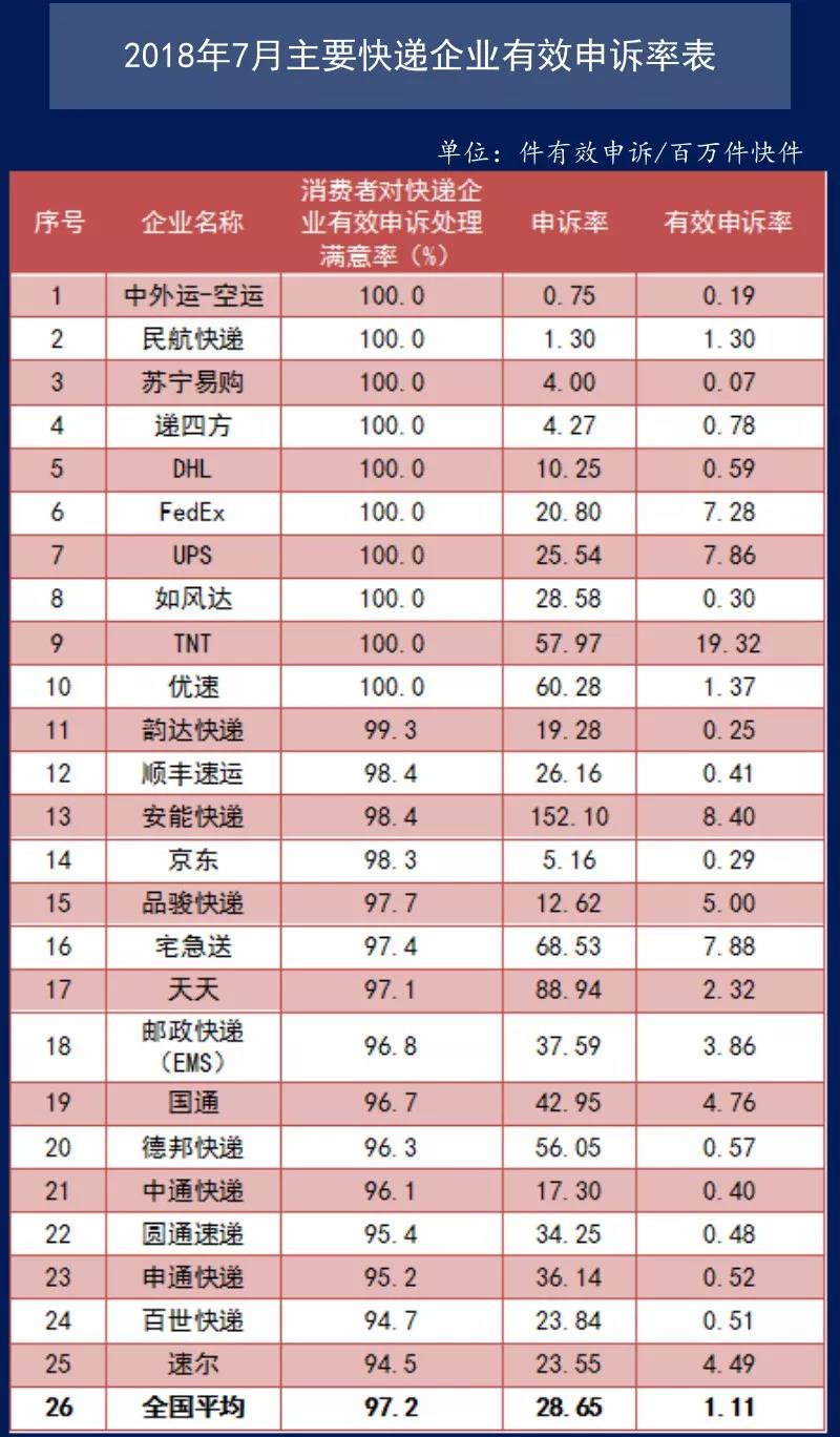 7月,消費(fèi)者對快遞企業(yè)有效申訴處理滿意率(消費(fèi)者對快遞企業(yè)有效申訴處理滿意件數(shù)與快遞企業(yè)有效申訴總量之比)為97.2%,低于全國平均有效申訴處理滿意率的快遞企業(yè)有9家。