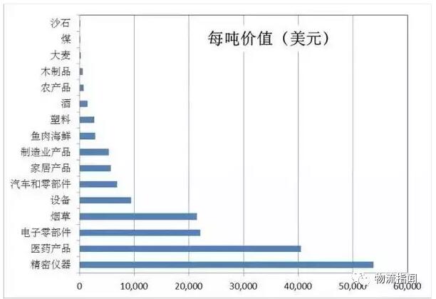 其次是經(jīng)濟水平?jīng)Q定的貨物價值。同樣一公斤貨,因為單公斤貨物價值的不同會對GDP產(chǎn)生很大影響。例如下圖是美國不同類別的貨物平均每噸的價值,可以看到差別非常大,一噸煤和一噸煙草價值可以相差100倍。同樣一噸貨物,價值更高對應(yīng)的GDP就更高。