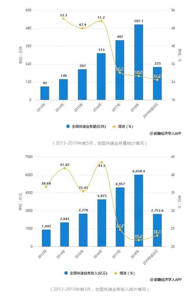 進(jìn)入2019年5月,全國(guó)快遞服務(wù)企業(yè)業(yè)務(wù)量為52.3億件,同比增長(zhǎng)25.2%;業(yè)務(wù)收入達(dá)618.1億元,同比增長(zhǎng)24.2%。累計(jì)方面,2019年1-5月,全國(guó)快遞服務(wù)企業(yè)業(yè)務(wù)量累計(jì)達(dá)到223億件,同比增長(zhǎng)24.9%;業(yè)務(wù)收入累計(jì)達(dá)到2753.6億元,同比增長(zhǎng)23.1%。